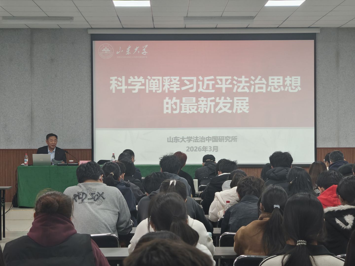 在博文楼528报告厅,肖金明教授作了题为《科学阐释习近平法治思想的最新发展》的学术报告。报告中,肖金明教授凭借深厚的理论积淀和前沿的学术视野,结合自身多年研究经验,从习近平法治思想的形成背景与发展历程切入,系统梳理了这一思想从孕育到成熟、从实践到理论的演进脉络,深刻阐释了其作为新时代全面依法治国根本遵循和行动指南的重大意义。