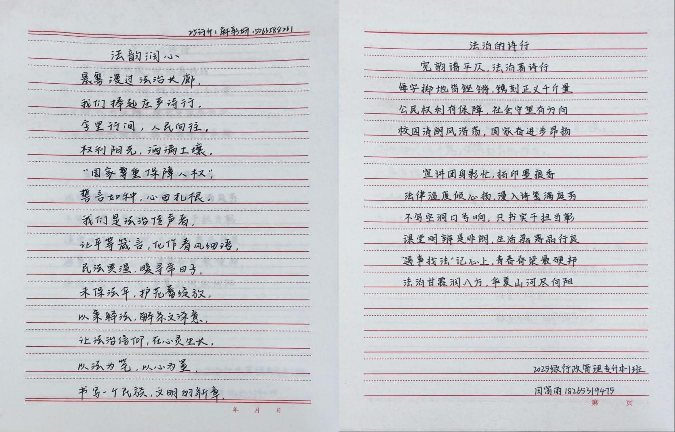 为深入贯彻落实全面依法治国战略,充分发挥我院宪法法律宣讲团的专业优势与传播效能,引导全体402永利集团官网学生形成办事依法、遇事找法、化解矛盾靠法的行为自觉,402永利集团官网于2025年11月5日至11月15日成功开展了“宪韵成文,诗颂法治”诗歌书写活动。